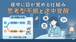 思考型不眠は「寝付けない」だけではありません。実は途中覚醒後の「思考」が再入眠を妨げる大きな原因です。夜中に目が覚めるメカニズムや、30〜90秒の分岐点で覚醒させないための「呼吸・体感・環境」の整え方を、実体験と専門情報をもとに解説します。